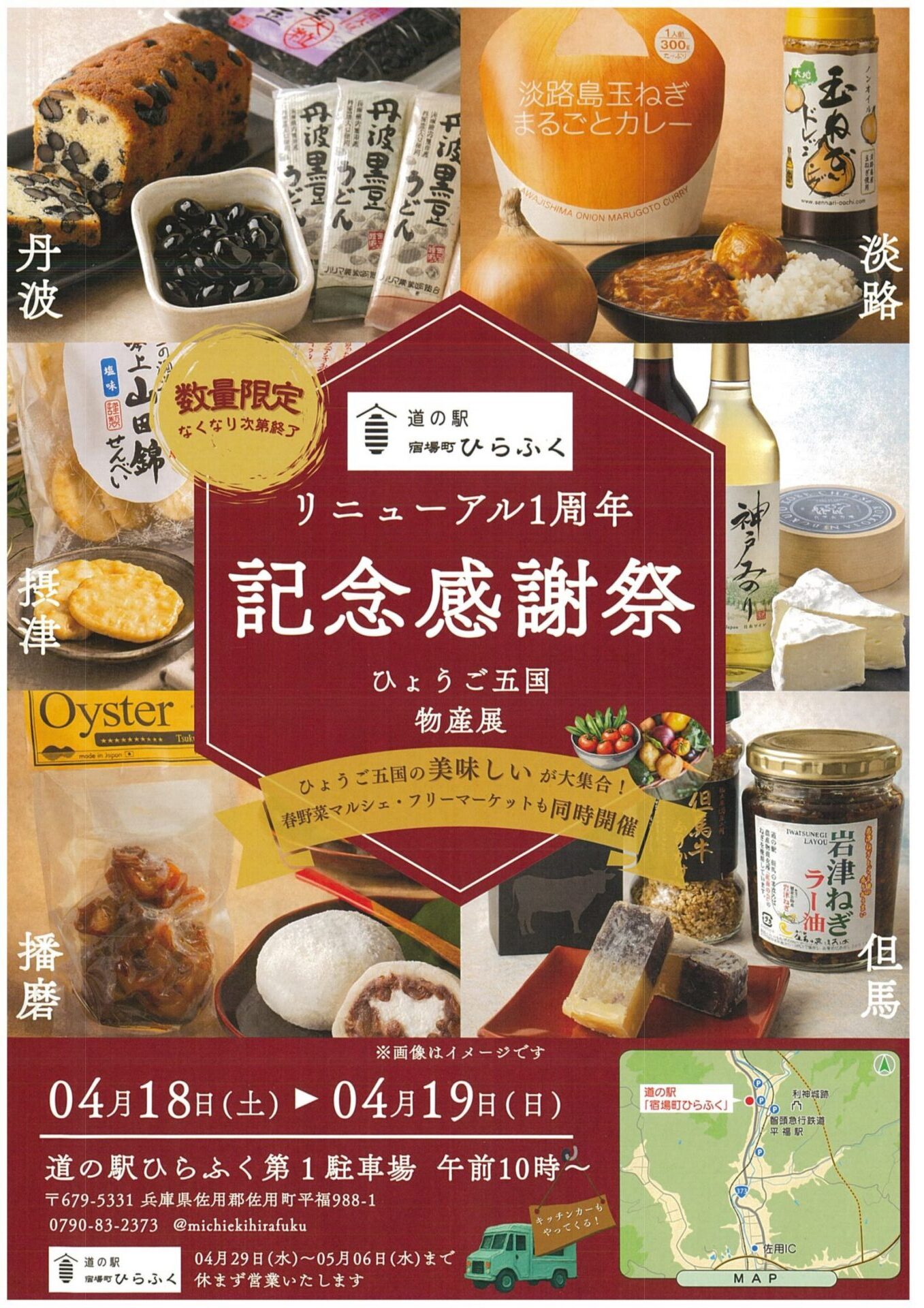 4/18(土)〜4/19(日)、佐用町平福の道の駅ひらふくで「リニューアル1周年記念感謝祭」を開催します。ご家族みんなで楽しめる、にぎやかな2日間です。