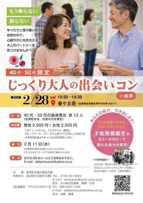 40代・50代限定の少人数制イベントとして、会話を大切にしながら交流できるプログラムを用意しています。ご興味のある方は、ぜひお申し込みください。